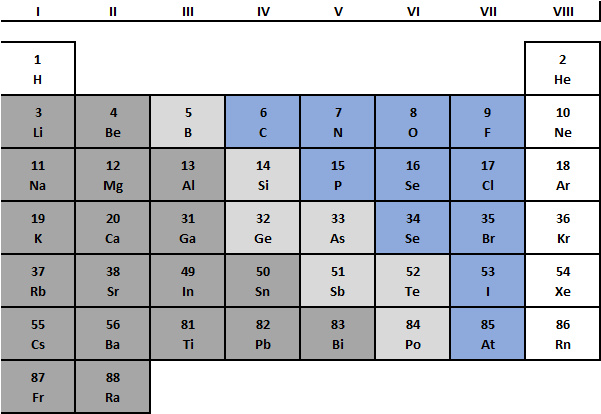 Wenn man das PSE auf die Hauptgruppenelemente zusammenstutzt, zeigt sich auch eine gesetzmäßige Verteilung von Metallen und Nichtmetallen. Dies ist in der Grafik unterhalb dargestellt, wobei dunkelgrau eingefärbte Elemente (links) Metalle sind, hellgrau eingefärbte Halbmetalle und bläulich eingefärbte (rechts) Nichtmetalle sind.