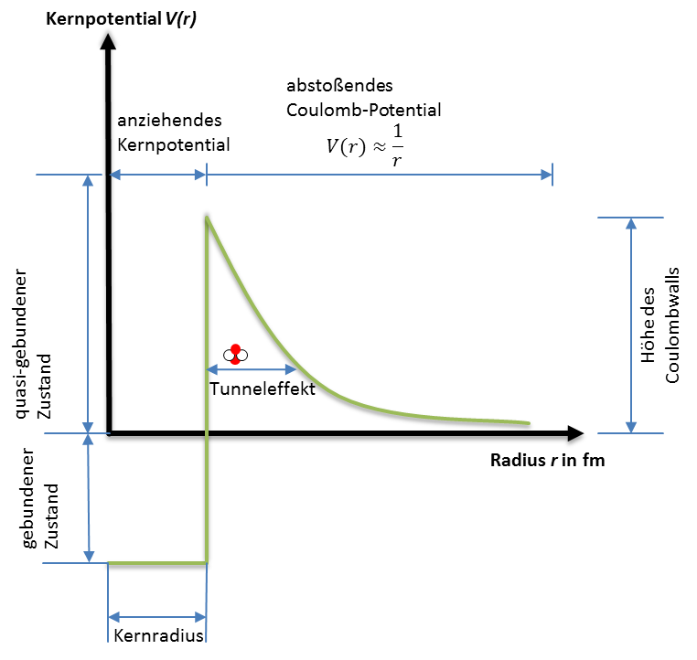 Durch die starke Wechselwirkung wird das α-Teilchen vom Kern angezogen, aber aufgrund gleichnamiger Ladungen elektrisch abgestoßen (Abb. 3). Die stärkere Kernkraft hat eine kurze Reichweite und die elektrische Abstoßung weist eine lange Reichweite auf. Es bildet sich das Kernpotential (V(r)). Der Wall ist höher als die kinetische Energie des α-Teilchens. Nach der klassischen Physik wäre das α-Teilchen stabil im Kern gebunden. Doch durch den quantenmechanischen Tunneleffekt kann es vorkommen, dass das α-Teilchen doch den Kern verlässt. Die Wahrscheinlichkeit dafür ist aber sehr klein. Sie bestimmt die Halbwertszeit und die kinetische Energie des Zerfalls.